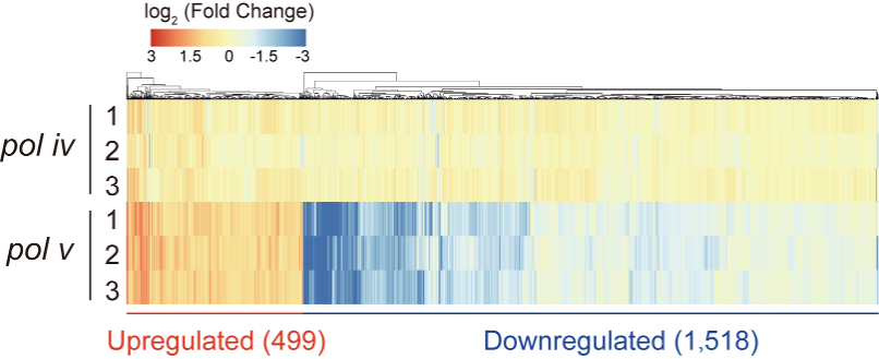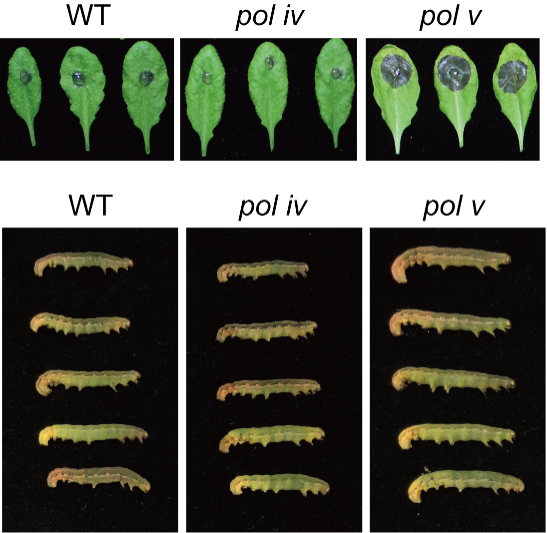 该研究在前期意外发现的指引下,首先通过对pol iv和pol v突变体进行mRNA-seq,鉴定受Pol V特异调控的基因。结果表明,近500个基因在pol v突变体中特异上调,近1500个基因下调(图一)。有趣的是,在pol v突变体中特异下调的基因,显著富集于茉莉酸(JA)信号通路,表明Pol V可正向调控JA信号通路。已知JA信号通路的激活与植物对死体营养型真菌和杂食性昆虫幼虫取食的防御密切相关。与前期发现相一致的是,pol v突变体对灰霉和甜菜夜蛾的抗性明显下降,而pol iv和其它RdDM通路突变体并无类似表型 (图二)。这些结果表明,Pol V可通过独立于RdDM通路的方式调控基因表达和植物对病虫的抗性。