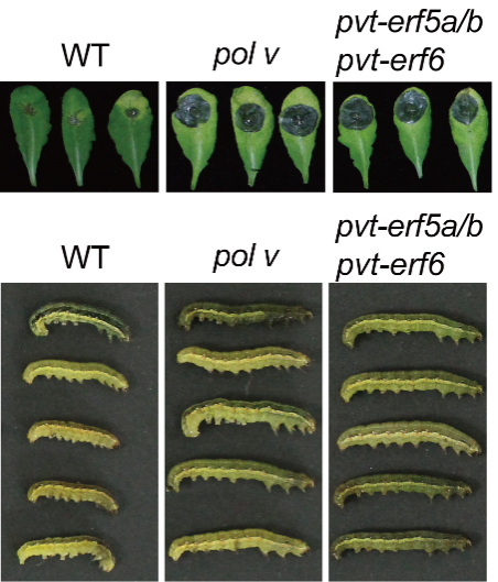图三:敲除ERF5和ERF6邻近的Pol V转录本导致植物对灰霉和甜菜夜蛾的抗性下降
