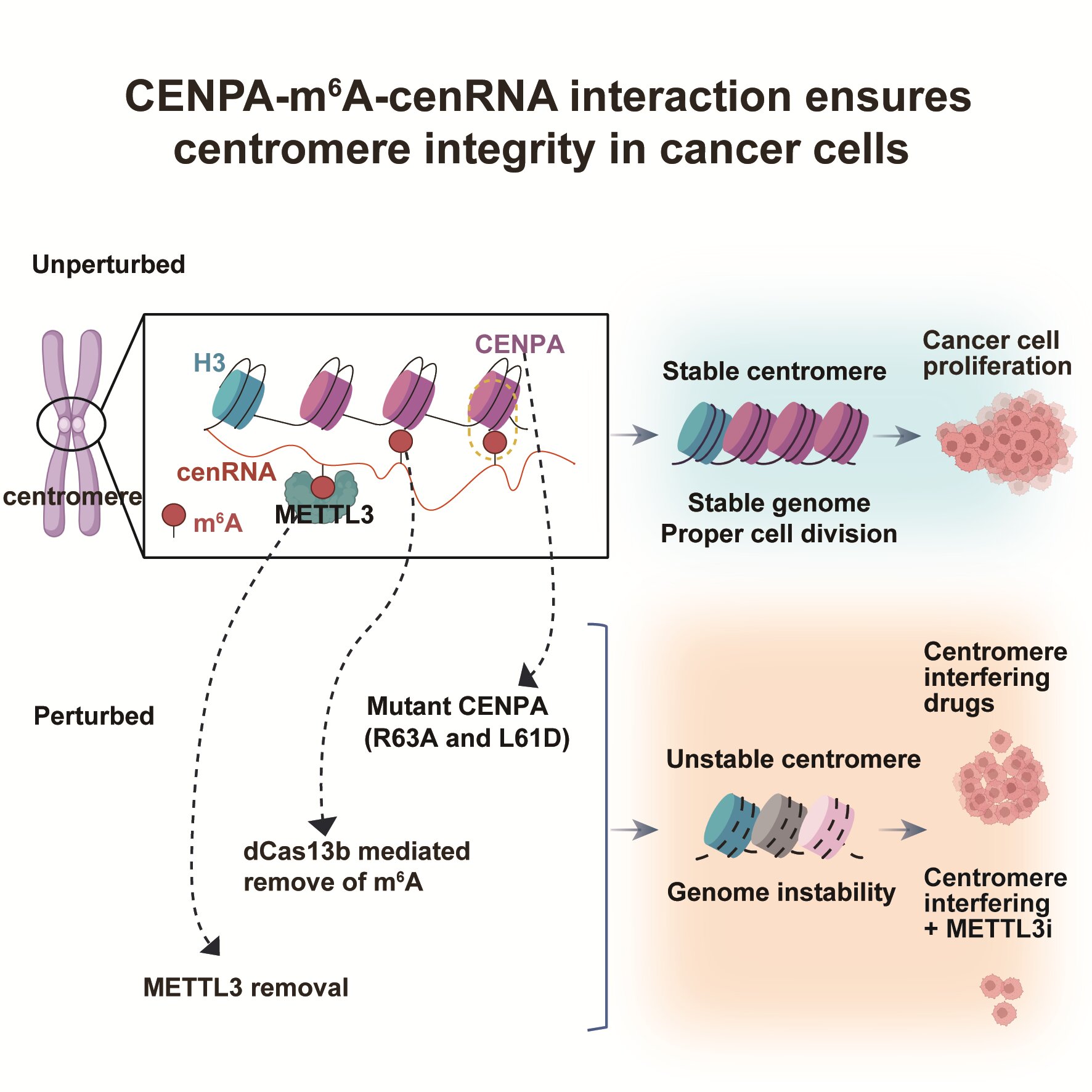 RNA m6A修饰(N6-甲基腺嘌呤)已被广泛报道几乎参与mRNA生命周期的所有阶段,与一系列复杂疾病的发生发展相关。近年来,越来越多的证据表明m6A修饰也存在于非编码RNA,特别是染色质结合的一些RNA(chromatin-associated RNAs,caRNAs)上,并介导新的功能,例如调控染色质状态和基因转录等。此前研究也发现着丝粒区域可以转录出着丝粒重复序列RNA (centromeric RNA, cenRNA),这些cenRNA似乎参与调控着丝粒稳态和细胞周期进程,但其关键机制仍不明确。