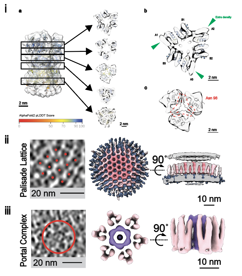 通过分析栅栏蛋白的组装规律,研究团队发现它们可灵活地排布成单元间距约为9 nm的蜂巢状结构(图2,ii)。在内核上,团队也发现了花朵状的孔道复合体(图2,iii)。这些孔道复合物由六个栅栏蛋白围绕一个孔道复合物构成,并局部扰乱周边栅栏蛋白的蜂巢状排列模式。这些看似随机分布的花朵状孔道复合物可能与病毒早期转录阶段的物质进出有关。