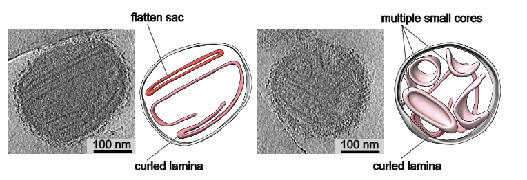 然而,以上所示的常规形态猴痘病毒仅占据全部病毒粒子约60%的比例,其余近40%病毒粒子则与以往报道的正痘病毒形态不同,其内核壁折叠成扁平囊状、卷曲层状或形成多个独立的小核,病毒内部的内核构造并不似红细胞一样闭合且双面凹陷。