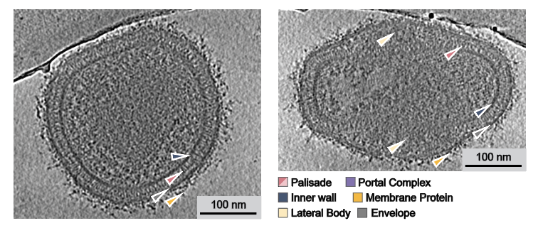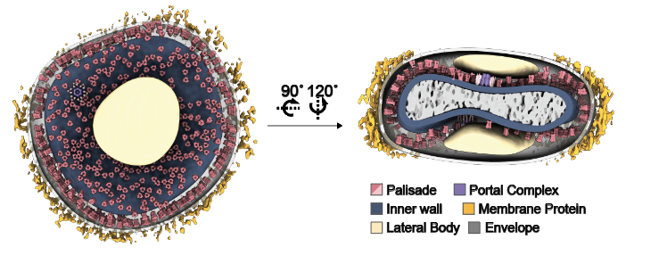 图1:猴痘病毒成熟病毒粒子的冷冻电子断层图像(正面及侧面)