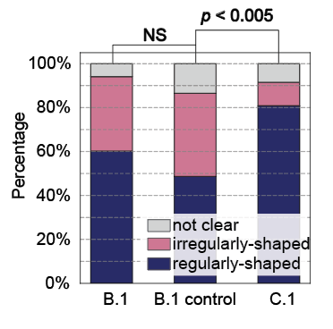 图5:C.1毒株中异常形态猴痘病毒粒子出现率显著低于B.1毒株