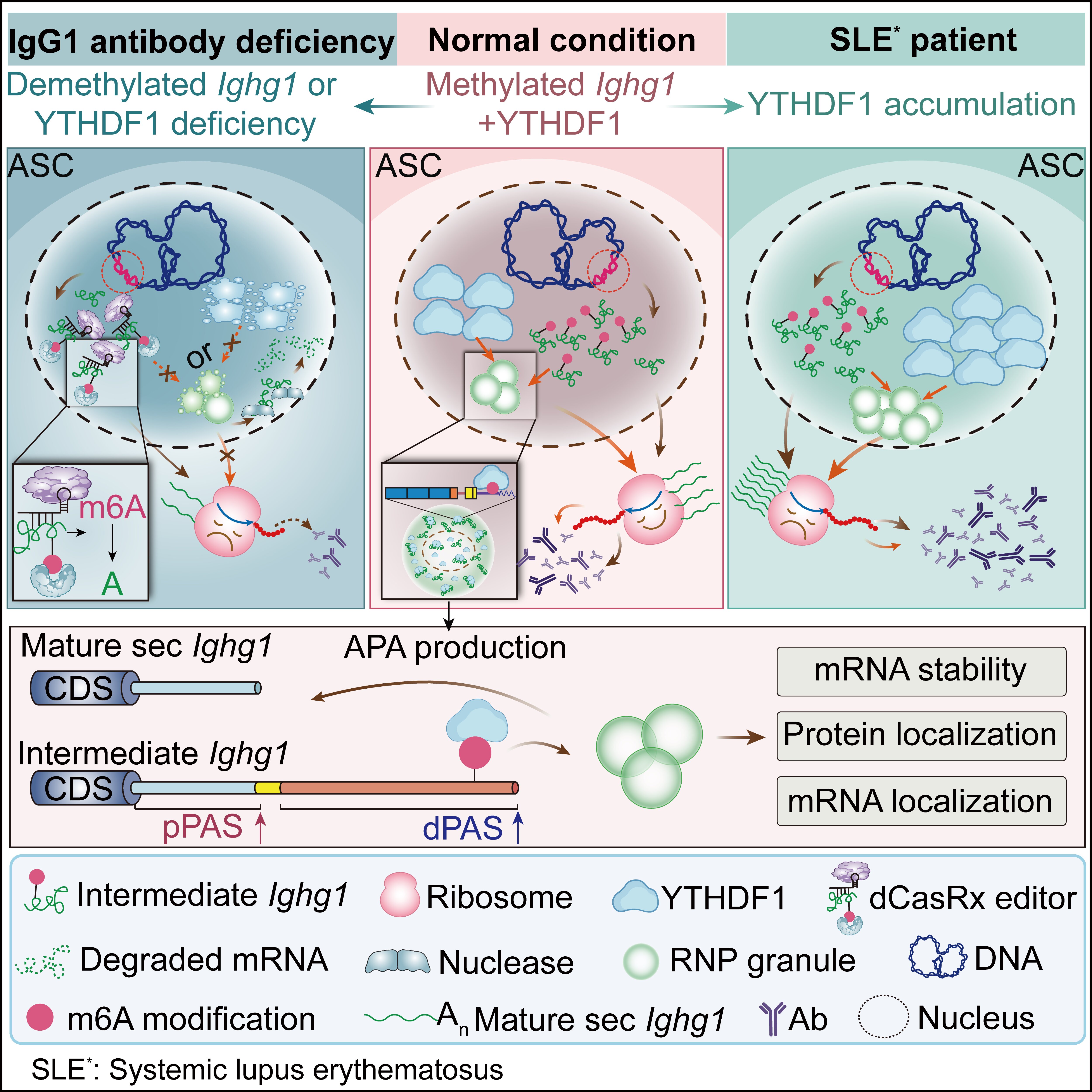 免疫系统中抗体分泌细胞(ASCs)的稳态调控在抗体应答和自身免疫疾病中扮演关键角色。2024年10月29日,best365中国官方网站生命学院、免疫学研究所、膜生物学全国重点实验室、教育部蛋白质科学重点实验室的刘万里教授及其团队在《Immunity》期刊上发表了题为《Progressive polyadenylation and m6A modification of Ighg1 mRNA maintain IgG1 antibody homeostasis in antibody-secreting cells》的研究论文。该研究聚焦于ASCs,揭示了IgG1编码mRNA的m6A修饰与抗体转录后调控的关键联系,并发现YTHDF1在IgG1抗体稳态维持中的重要作用,为其在系统性红斑狼疮(SLE)中的治疗潜力提供了新的视角。