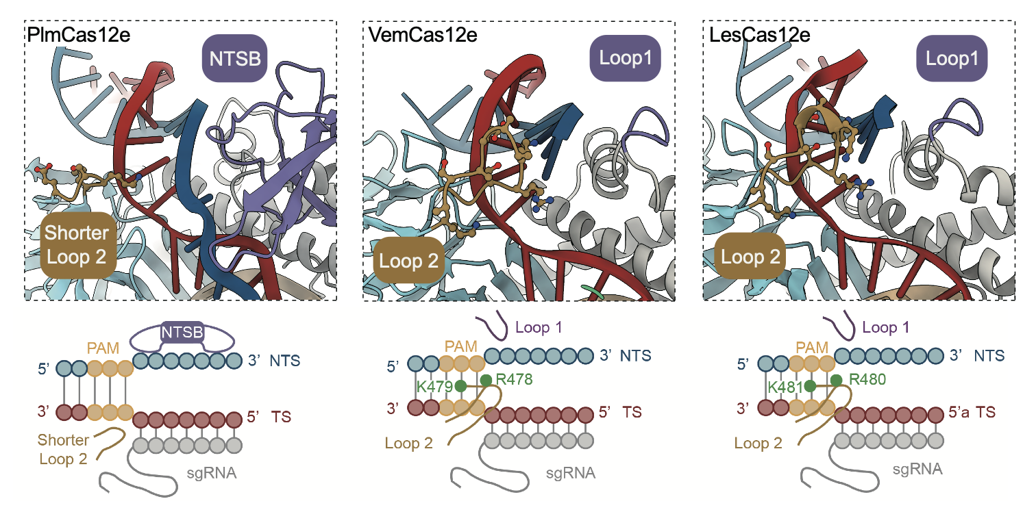进一步,课题组通过单颗粒冷冻电镜技术解析了VemCas12e和LesCas12e的三元复合体结构。分析发现,在高盐条件下,同源蛋白间不同的R-loop形成能力和Cas蛋白中负责解旋DNA双链的结构有关(图2)。部分Cas12e蛋白(如PlmCas12e和DpbCas12e)含有独特NTSB结构域。这一结构域能够在高盐条件下促进DNA解旋而增强切割活性。相比之下,缺乏该结构域的Cas12e蛋白(如VemCas12e和LesCas12e)则依赖富含正电氨基酸残基的短肽环结构(如Loop 1和Loop 2)进行DNA解旋,但其对R-loop形成的促进作用相对较小,因而切割效率相对较低。总之,能够在高盐浓度条件下促进R-loop稳定形成的结构有利于实现更高的DNA双链切割活性。与此相符的是,Plm2Cas12e蛋白的NTSB结构域缺乏一些和非靶标链(NTS)、靶标链(TS)相互作用的关键氨基酸残基,因而在高盐浓度的条件下表现出较低的双链切割活性;而OpbCas12e蛋白在RuvC核酸酶结构域具有一个能够促进R-loop形成的Helix-loop结构,从而在高盐浓度的条件下有相对更高的双链切割活性(图1)。这些结构差异揭示了Cas12e家族的功能多样性的结构基础。