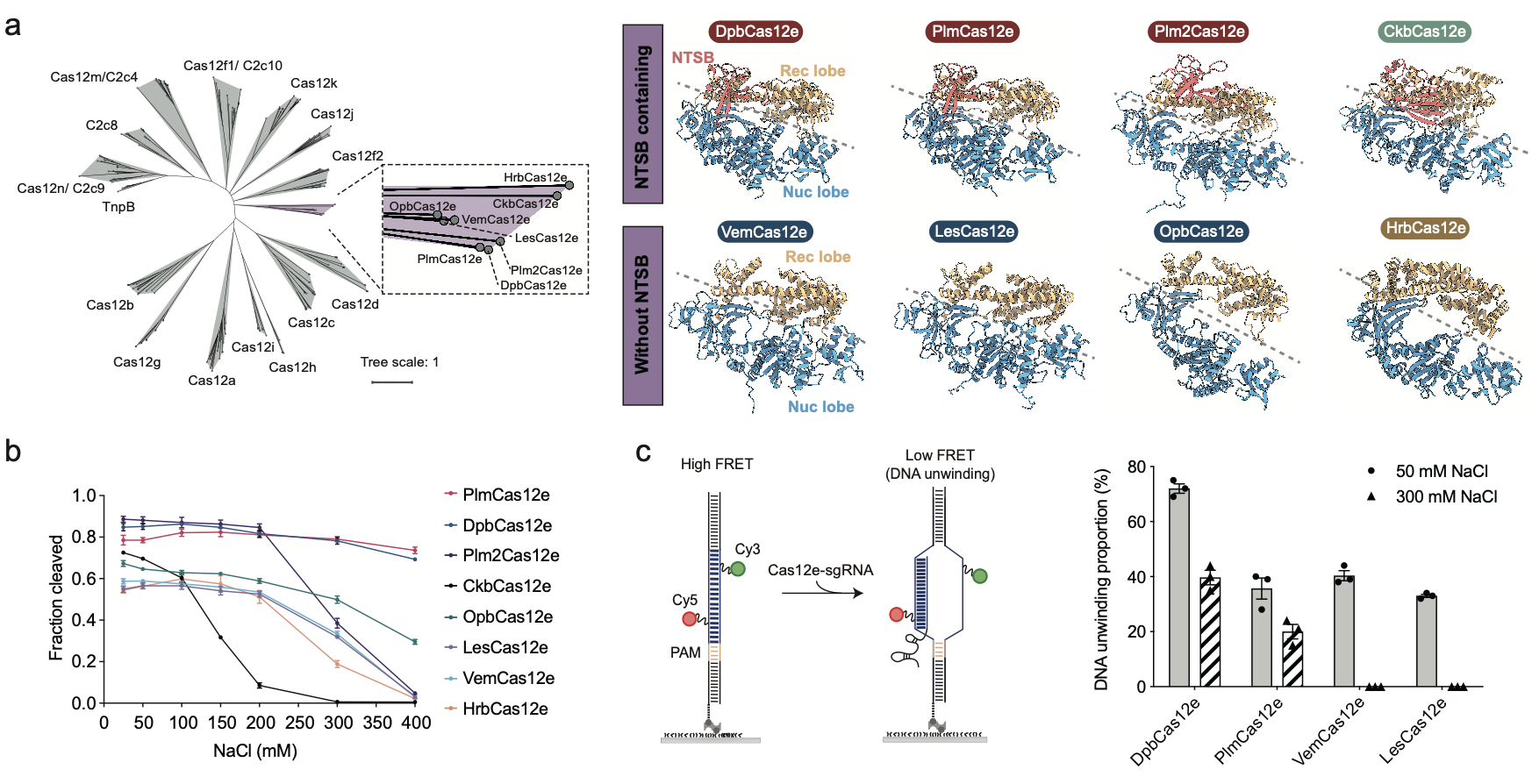 研究团队通过生物信息学分析出六种新的Cas12e同源蛋白,其大小在818-920个氨基酸残基(图1)。从预测的结构上分析,这些蛋白的非靶标链结合(NTSB)结构域有明显差别。生化实验表明,Cas12e蛋白偏好识别富含T或C的PAM序列,并且表现出多样的靶向DNA干扰能力。利用单分子FRET实验,研究进一步发现,Cas12e蛋白的切割效率与盐浓度密切相关。在低盐条件下,这些蛋白表现出更高的R-loop形成能力和切割活性,而高盐条件则会显著抑制其活性(图1)。这一结果揭示了盐浓度对Cas12e功能的调控作用,并为其在复杂环境中的应用优化提供了指导。