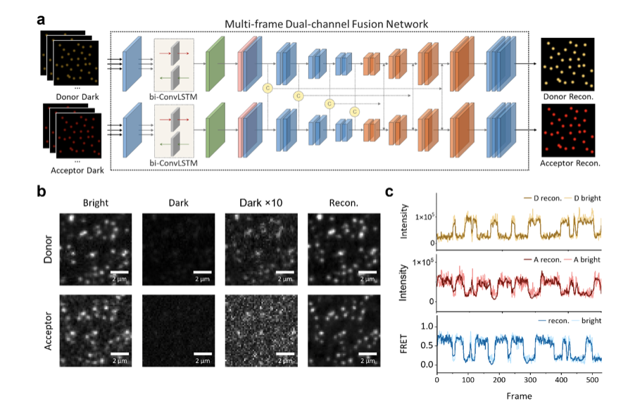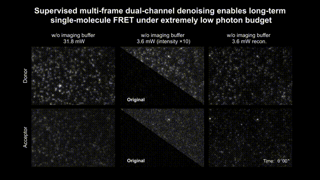 基于相机的单分子荧光共振能量转移(FRET)技术能够精确测量来自单个荧光分子的信号,从而表征和揭示生物大分子的重要动态过程。该技术以其较高的实验通量、优越的技术成熟度成为阐释生物大分子结构变化、反应途径和分子机制的重要生物物理学手段。 然而,现有实验手段从图像中准确识别源自单个分子的荧光信号需要600-700个光子,但荧光分子在光漂白前发出的总光子是有限的,这使得单分子FRET技术的总观测时长和时间分辨率总是相互制约,很难同时提升。常规的解决方案包括提升相机的光子探测效率、优化荧光分子结构或添加除氧剂、三线态淬灭剂等化学方法以提高探针光稳定性。然而,数据驱动的策略仍是一个未充分开发的领域。