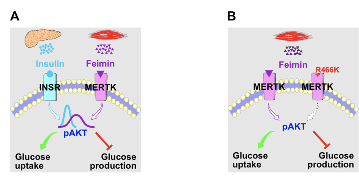 鉴于Feimin-MERTK信号轴在降低餐后血糖中的关键作用,研究团队对临床样本开展了遗传分析,发现携带MERTK(R466K)突变的个体餐后血糖水平升高。体外实验进一步显示,MERTK R466K显著降低了Feimin与受体的结合能力,进而削弱了AKT的激活,这可能解释了突变携带者餐后血糖水平升高的原因(见图1B)。