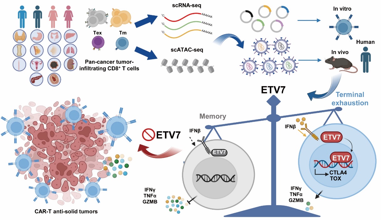 图1. 肿瘤病人单细胞多组学与筛选鉴定到ETV7作为调控CD8+T细胞命运的转录焦点,促进CD8+T细胞的终末分化(耗竭)与功能缺失。靶向ETV7有效增强CAR-T杀伤实体瘤的效率。