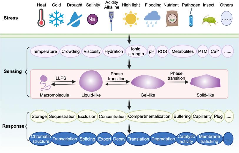 图1. 生物分子凝聚体在胁迫感知与响应中的作用