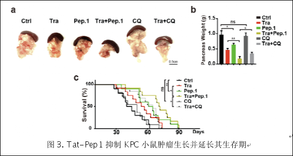 在RAS突变的肿瘤细胞系与结直肠癌病人中,PI4KB在S256与T263位点的磷酸化水平均显著上调,表明PI4KB在S256与T263位点的磷酸化可能作为RAS突变肿瘤治疗的一个非经典自噬的特异性靶点。研究者设计并合成的Tat-Pep1底物肽可以靶向抑制PI4KB在S256与T263位点的磷酸化进而抑制RINCAA活性,最终抑制KPC胰腺癌模型的肿瘤生长,延长KPC胰腺癌模型生存期,效果比自噬通用药物氯喹更好(图3)。Tat-Pep1底物肽靶向RINCAA的高特异性同时保持机体的免疫活性,奠定了PI4KB磷酸化可作为一种非常有潜力的靶向自噬的肿瘤治疗靶点。未来基于靶向PI4KB在S256和T263磷酸化的小分子药物也将为临床RAS突变肿瘤病人带来新的希望。