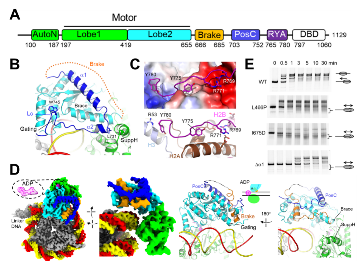 该工作还发现了ISWI的多个特异调控构象:ADP⁺,ADP*⁺,ADPS以及ADPB。ADP⁺和ADP*⁺具有正向调控元件:RYA(arginine-tyrosine anchor)和PosC(图 2A-C)。ADP⁺和ADP*⁺构象常见于核小体接头DNA较短一侧,可能起到弥补 DNA结合结构域(DBD)锚定不足的作用,从而稳定马达对核小体的结合,促进染色质重塑活性。相反,在ADPB 状态下,正向调控元件作用消失,而新生成的 Brake 元件通过变构作用,导致马达蛋白异常开放,从而落入失活状态(图2D-E)。据此,研究人员提出了染色质重塑的刹车机制,阐明了ISWI 家族特异的接头 DNA 感知机制。