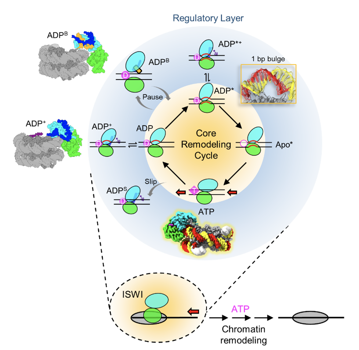 DNA缠绕组蛋白八聚体形成的核小体是染色质的基本单元。染色质重塑蛋白(chromatin remodeler)利用ATP水解的能量移动核小体,从而调节染色质结构与基因表达。染色质重塑蛋白包含4个主要家族:SWI/SNF,ISWI,CHD和INO80,它们具有多种生物学功能。其中,SWI/SNF帮助形成开放的染色质,促进基因表达;而ISWI则感知接头DNA的长度,促进等间距核小体阵列排布,推动紧密染色质结构形成。不同的染色质重塑蛋白具有高度保守的马达结构域(motor domain),是染色质重塑反应的核心。而过度的染色质重塑反应需被抑制,从而避免破坏染色质结构。染色质重塑马达如何克服核小体中组蛋白与DNA的相互作用,滑移核小体的机理并不完全清楚。