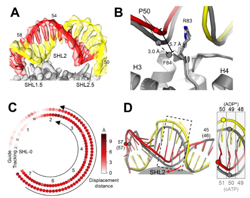 图1 存储1 bp DNA隆起的ADP*状态结构。(A)ADP*状态下,DNA隆起的电镜密度图。(B)局部DNA-组蛋白相互作用分析。ATP状态,灰色;ADP*状态,彩色。在ADP*状态下,DNA与组蛋白局部相互作用被破坏。(C)相对于ATP状态,ADP*状态的DNA磷酸骨架位移距离热图。ADP*状态下,两股DNA链从入口端向核小体内部移动(箭头方向),1 bp DNA形变储存在SHL2位置。(D)ATP状态(灰色)与ADP*状态(彩色)位于SHL2处的DNA结构对比。