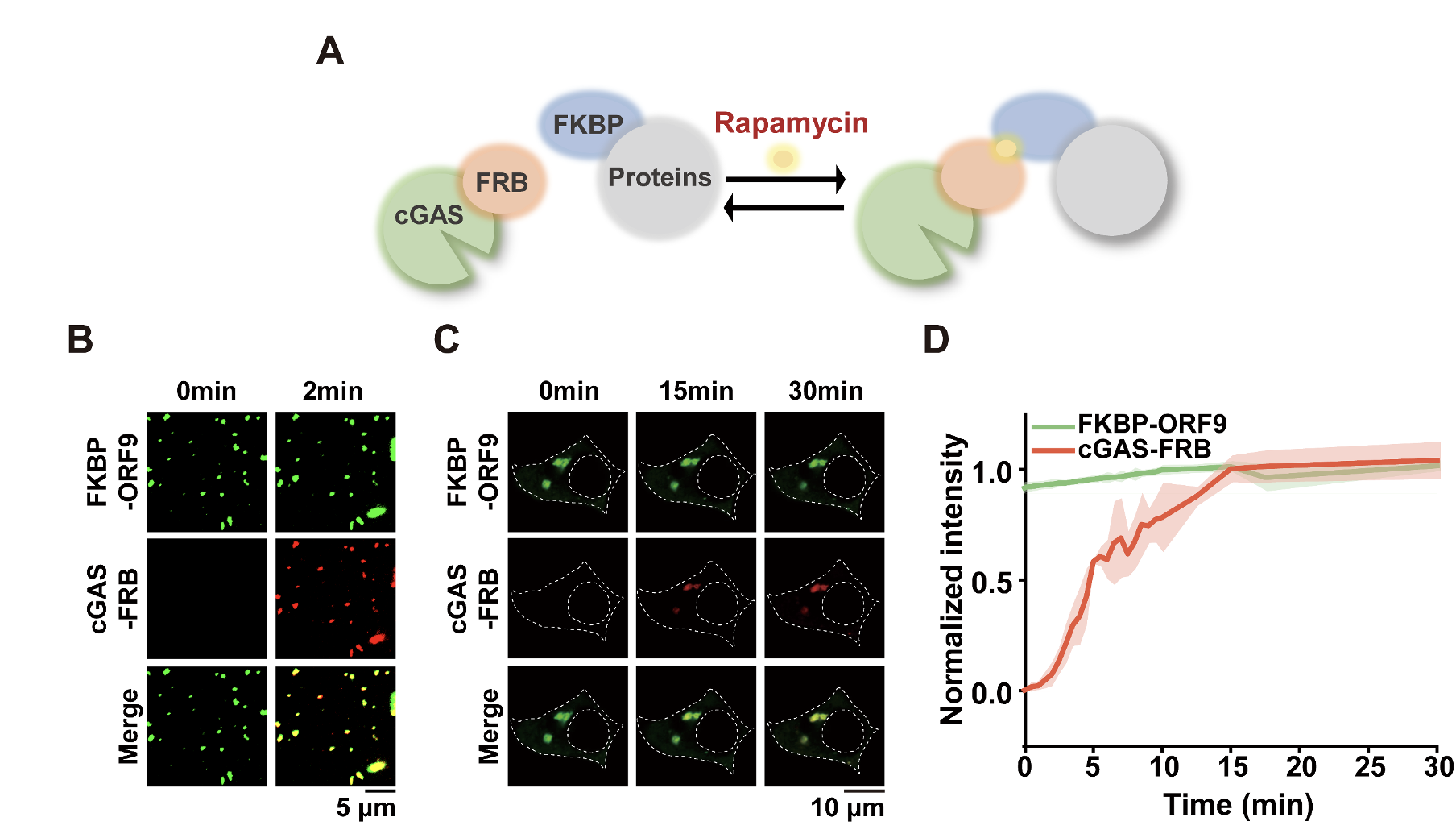基于研究揭示的分子相互作用逻辑,研究人员提出通过可控调节蛋白与cGAS的相互作用力的强弱实现对cGAS相分离和激活的调节。化学小分子雷帕霉素可以诱导蛋白结构域FKBP与FRB的相互作用。基于这一化学诱导手段,利用雷帕霉素调控FKBP-抑制蛋白与cGAS-FRB的亲和力,使cGAS在2分钟内重新形成液滴状结构。同时,该诱导系统成功在5-15min内迅速在活细胞内诱导cGAS相分离,并显著增强其活性。