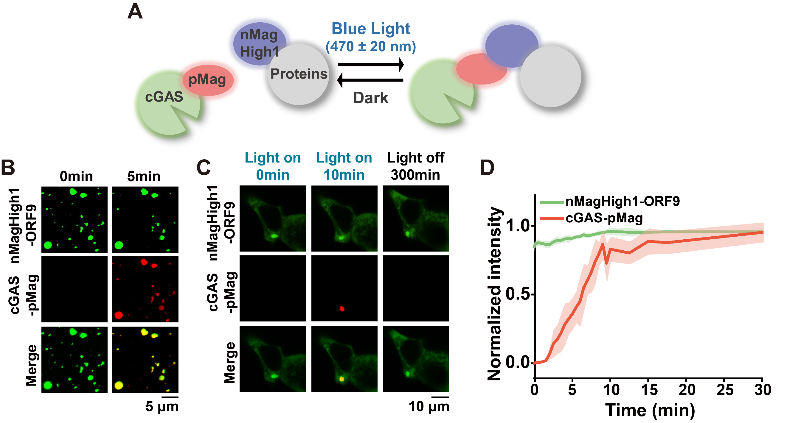 光控诱导往往比化学诱导具有更高的空间可控性。研究人员利用蓝光照射促使pMag-nMagHigh1二聚化,从而增强nMagHigh1-抑制蛋白与cGAS-pMag的亲和力,诱导cGAS快速相分离。在活细胞中,该光控分子开关可逆地调控cGAS相分离,蓝光终止后,cGAS凝集体逐渐解离。
