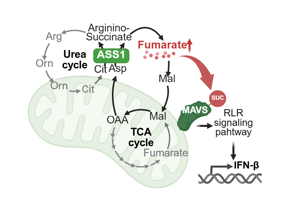 2025年4月18日,best365中国官方网站江鹏研究组在《自然·微生物学》(Nature Microbiology)期刊发表题为“巨噬细胞代谢重塑天冬氨酸-精氨基代琥珀酸支路产生延胡索酸以抵御病毒”(Metabolic remodelling produces fumarate via the aspartate–argininosuccinate shunt in macrophages as an antiviral defence)的研究论文。此前,江鹏研究组发现了尿素循环代谢异常决定肿瘤和巨噬细胞的命运(Nature, 2019; Mol Cell, 2022),并系统研究了TCA cycle代谢在抗肿瘤和免疫调控中的作用 (Cell Metab, 2023; Nat Chem Biol, 2022)。在该项研究中,研究人员发现,病毒感染早期可促使巨噬细胞中的尿素循环与三羧酸(TCA)循环发生协同重编程,形成一个闭环的代谢通路,称为天冬氨酸–精氨基代琥珀酸(Aspartate–Argininosuccinate, AAS)旁路。研究通过RNA测序、非靶向代谢组学分析和同位素示踪等手段,证实该旁路由胞质中的精氨基代琥珀酸合成酶(ASS1)驱动,进而促进延胡索酸(fumarate)生成,并增强炎症信号传导。功能实验表明,敲除ASS1会显著降低细胞内延胡索酸水平,抑制干扰素-β(IFN-β)的表达,并削弱线粒体呼吸功能。更为关键的是,病毒感染或外源性补充延胡索酸酯可通过促进线粒体抗病毒信号蛋白(MAVS)琥珀酸化,激活视黄酸诱导基因-I样受体(RIG-I-like receptor)信号通路,从而增强IFN-β的表达。这一机制不仅在囊泡性口炎病毒(VSV)感染模型中得到验证,也同样适用于仙台病毒和甲型流感病毒等其他病毒感染。此外,感染埃博拉病毒病患者的单核细胞呈现ASS1表达上调。ASS1缺失的小鼠在VSV感染后则显现出干扰素应答受损的表型。该研究揭示了早期病毒感染诱导的由ASS1驱动的AAS旁路是巨噬细胞中延胡索酸的重要来源,明确了其在调控抗病毒先天免疫中的关键作用,为代谢干预调节免疫功能提供了潜在靶点。