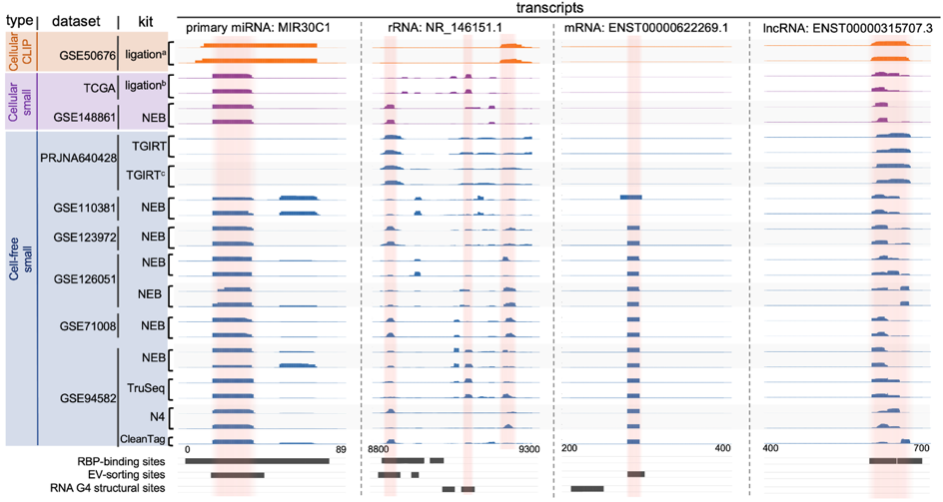 为了确认在体液细胞外数据中也可以检测到稳定的cfRNA信号,作者对比了细胞内CLIP-seq(CL-CLIP-seq)、细胞内小RNA-seq(CL-smRNA-seq)和细胞外小RNA-seq(CF-smRNA-seq)的读段覆盖图谱。使用经典的CLIPper工具进行传统的峰值/峰区的识别/检出。在已知cfRNA种类的转录本中展示了四个示例区域(峰区所在转录本)。总体上,对于未捕获或未免疫共沉淀的测序数据,如CL-和CF-smRNA-seq,不同转录本类型中均存在可稳定识别的峰区信号。