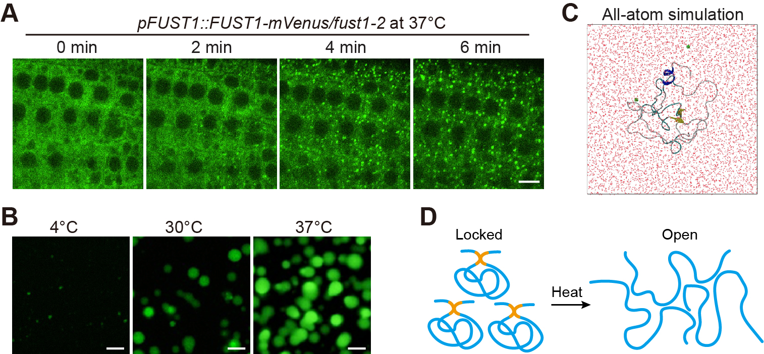 图1. FUST1直接感受高温发生相分离。(A)植物细胞受到高温刺激后FUST1在细胞质中迅速发生相分离形成凝聚体;(B)FUST1体外相分离随着温度升高而增强;(C)全原子分子动力学模拟示意图;(D)FUST1的PrLD区域编码一个温度开关。