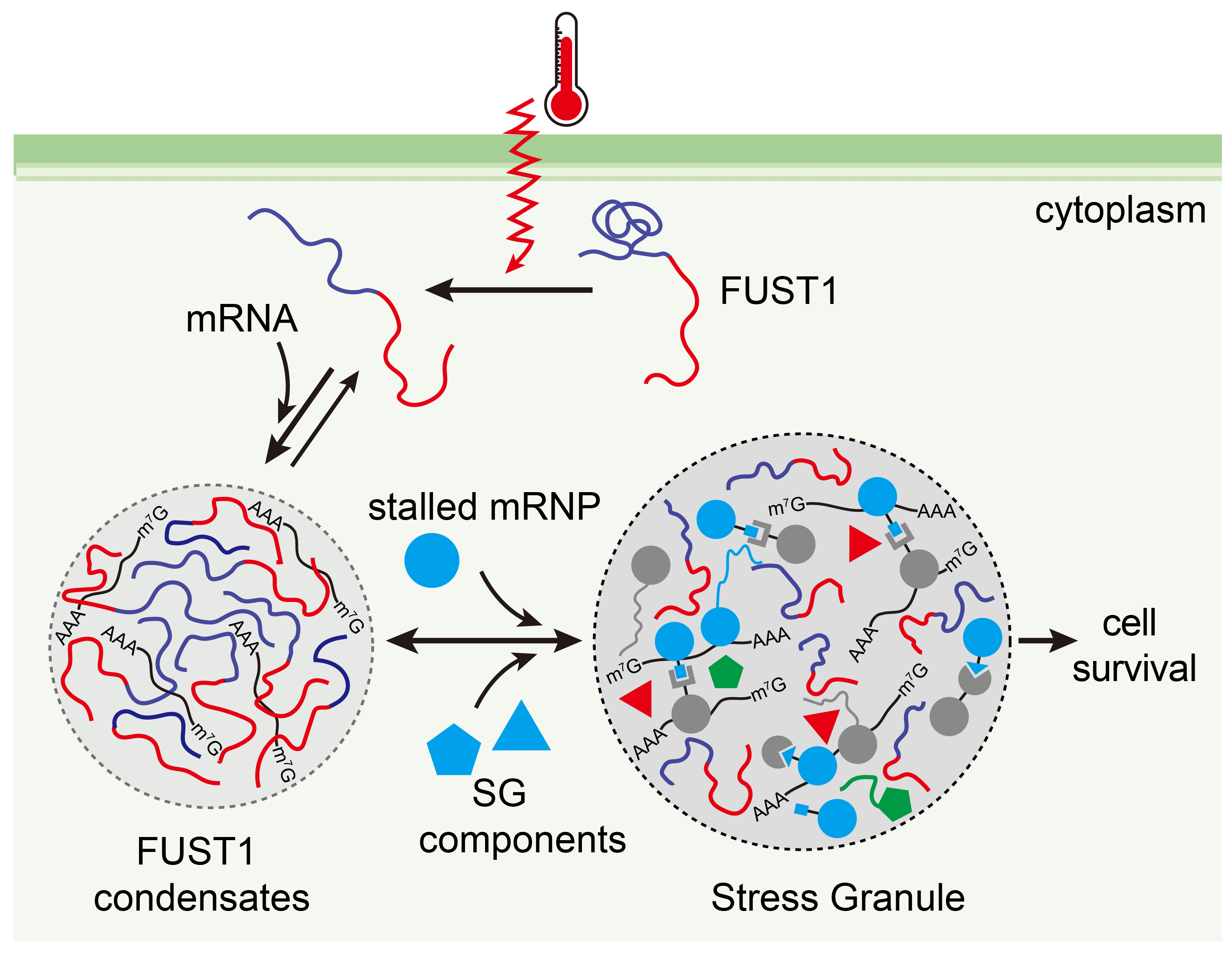 随着全球变暖进程加剧,高温胁迫成为影响农业生产最严重的自然灾害之一,解析植物感知和响应高温胁迫的机制,对于实现作物高产稳产至关重要。近几年研究发现,细胞内生物大分子的相分离是重要的温度感知机制,然而温度感知的分子基础尚不清楚。应激颗粒(stress granules)是细胞应对各种胁迫时产生的保守的凝聚体。在植物中,高温胁迫诱导应激颗粒形成,对植物适应热胁迫至关重要。