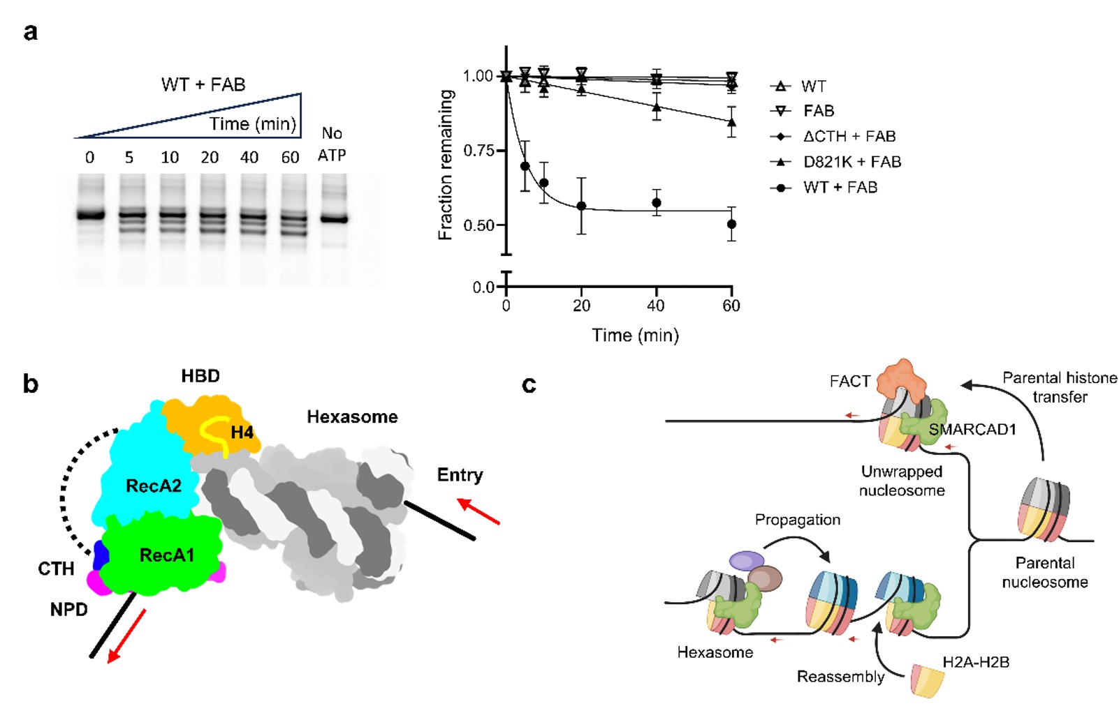 图3 SMARCAD1-FACT相互作用及功能协同。(a)SMARCAD1与FACT协同重塑核小体。右图是核小体滑移的动力学跟踪分析。WT:野生型SMARCAD1全长蛋白;D821K:具有D821K突变的SMARCAD1;ΔCTH:将CTH截短的SMARCAD1蛋白;FAB:FACT与H2A-H2B 二聚体混合物。(b)SMARCAD1滑移hexasome的卡通模式图。(c)SMARCAD1在复制叉区域发挥功能的可能模式:帮助亲代组蛋白转移到子代;推动复制后抑制性组蛋白修饰扩散,以及滑离过于靠近的亚核小体与核小体,帮助重新组装染色质。