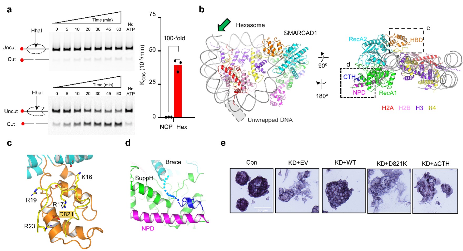 SMARCAD1是一种非经典的染色质重塑蛋白,对DNA损伤修复以及胚胎干细胞的异染色质维持起重要作用。研究人员通过多种染色质重塑活性检测方法,意外发现SMARCAD1对亚核小体有显著的活性,而对经典核小体的活性微弱(图1a)。为揭示这一独特偏好性的机制,研究者通过冷冻电镜单颗粒技术解析了SMARCAD1结合六聚核小体的复合物结构(图1b)。与经典的结合方式不同,SMARCAD1马达结构域转向六聚核小体中因DNA解缠绕留下的开放区域。电镜结构揭示了SMARCAD1内部的几个关键构造特征。其中,马达内部插入有一个独特的组蛋白结合结构域(HBD,图1c),HBD与H4的相互作用对SMARCAD1的染色质重塑活性至关重要;SMARCAD1的C-端螺旋(CTH,图1d)向外延申并顺势结合到NPD上,从而把两个核心的马达结构域连接起来,这对偶联ATP水解和DNA滑移必不可少。在小鼠胚胎干细胞中,研究者通过敲低、回补Smarcad1基因证实HBD, CTH等关键元素对Smarcad1发挥干细胞多能性维持作用不可或缺(图1e)。
