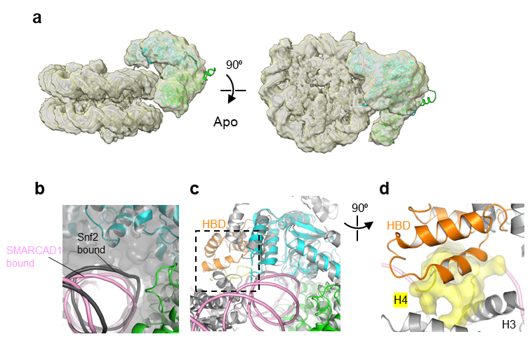 图2 SMARCAD1结合经典核小体的冷冻电镜结构。(a)SMARCAD1结合核小体的apo状态冷冻电镜结构。(b)核小体DNA在Snf2(表面模型)与SMARCAD1(卡通模型)结合时的构象对比。SMARCAD1不能紧密结合核小体,两者之间有明显空隙。(c-d)假设以经典模式结合核小体,SMARCAD1将与核小体的组蛋白发生空间排斥。(c)的虚线框中的区域被旋转,放大展示在(d)。
