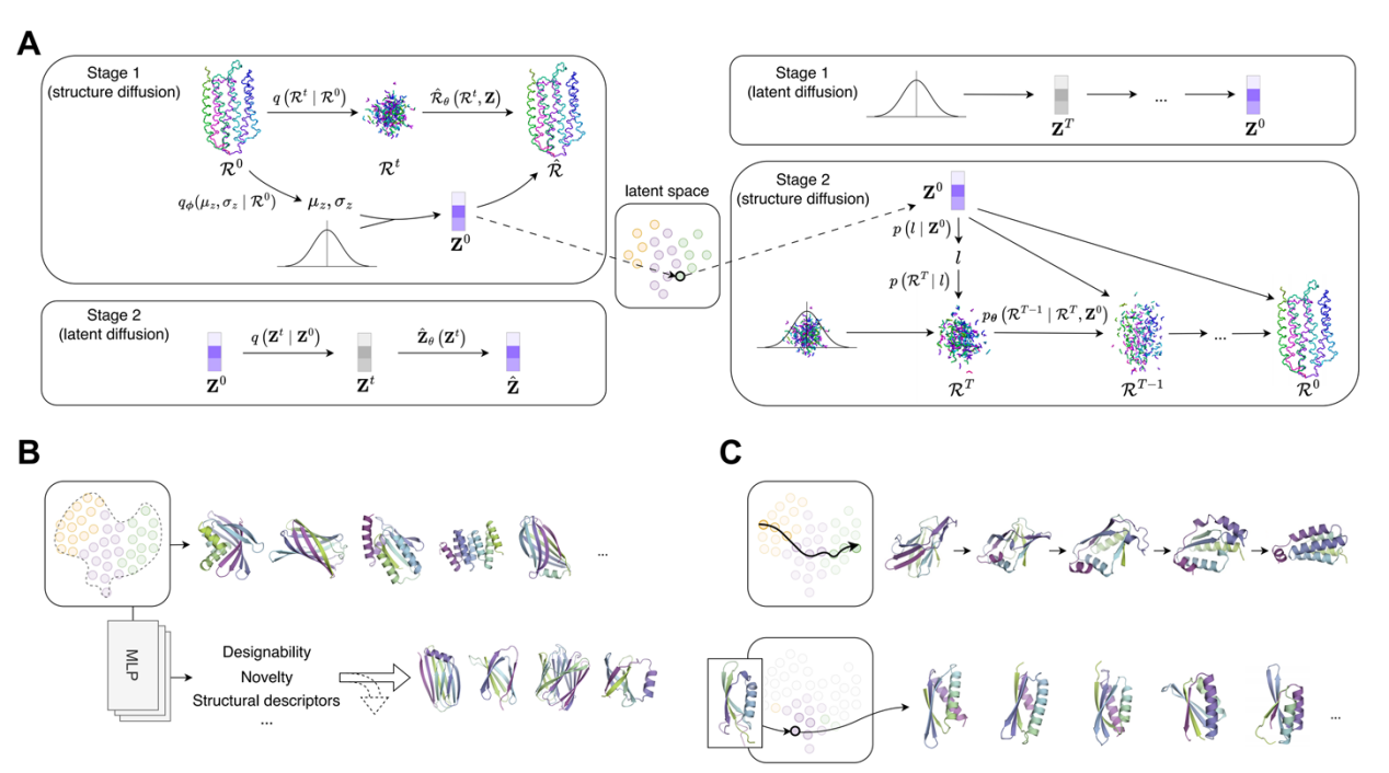 这样的设计思想通过一个双阶段流程得以实现:首先,通过联合训练,使编码器学会“理解”并绘制蛋白质的几何蓝图,而解码器则学会“执行”该蓝图指令;随后,再训练一个轻量级的潜空间扩散模型,用于学习并采样新的、多样的全局几何编码。最终,整个生成过程演变为先采样一个全局编码,再由解码器据此生成完整结构,实现了从宏观到微观的清晰、可控的设计流程。