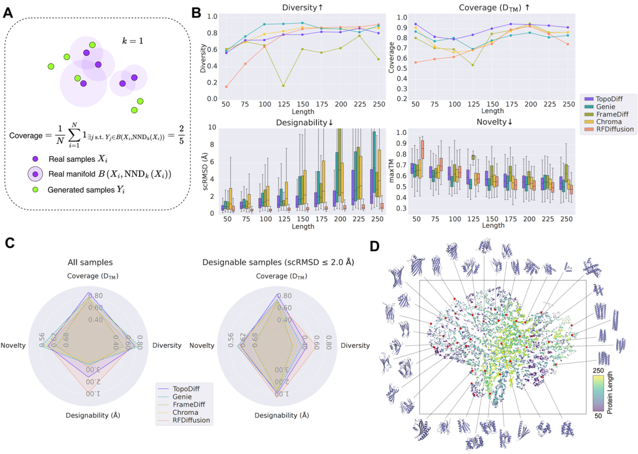 为定量评估模型对已知折叠空间的覆盖能力,解决现有指标的空白,团队首次在蛋白质设计领域引入了“覆盖度”(Coverage)评估指标。在与多个前沿模型的性能基准测试中,结果显示,TopoDiff在保持高可设计性的同时,其覆盖度指标显著优于所有基线模型,尤其是在传统模型代表性不足的折叠类型上,展现出明显的优势,有效修正了采样偏差。更有趣的是,其独特的隐空间设计解锁了多种全新的可控生成模式,如属性引导生成、隐编码插值、全局与局部协同控制等,极大地丰富了蛋白质设计的工具箱。