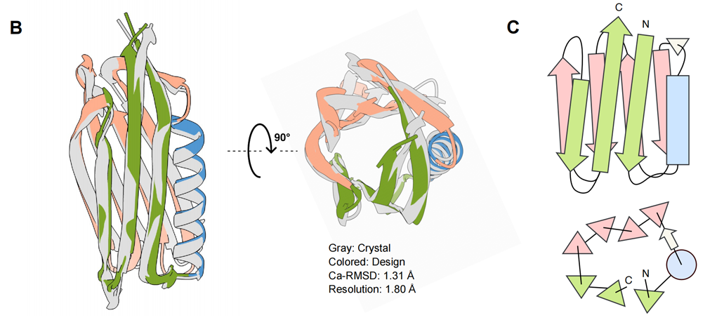 图3: 新颖β蛋白的从头设计及实验验证