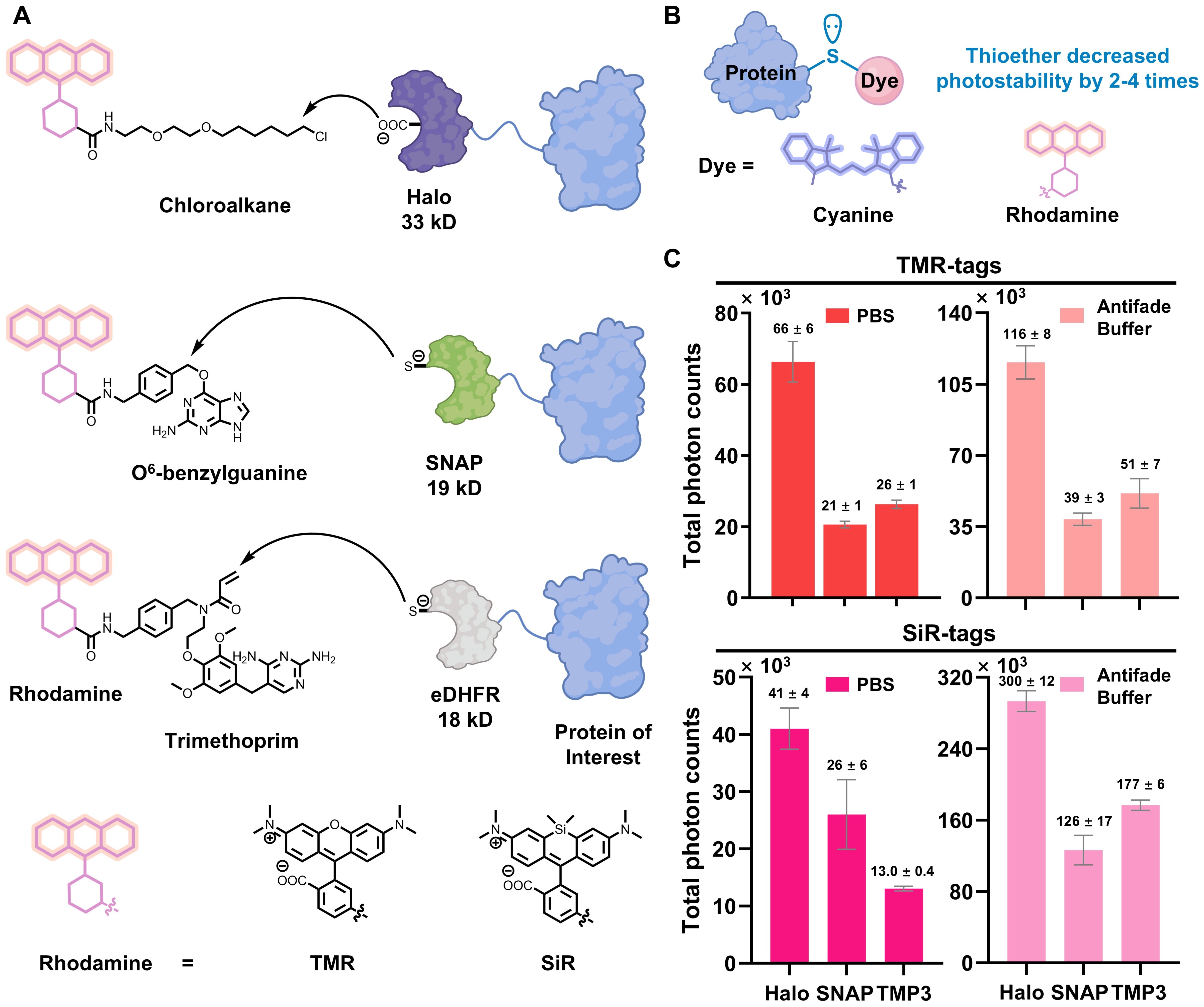 研究团队前期的工作发现,邻近硫醚基团的存在会显著降低染料的光稳定性。对于目前广泛应用的三类SLPs而言,SNAP-tag和TMP-tag3在共价结合过程中均会在染料附近生成硫醚基团,而HaloTag的共价反应不产生硫醚。已有研究指出,对于同一罗丹明染料在HaloTag体系中的光稳定性往往优于在SNAP-tag中的表现。研究团队推测,这种差异可能部分源于SNAP-tag和TMP-tag3所固有的硫醚基团带来的负面影响。