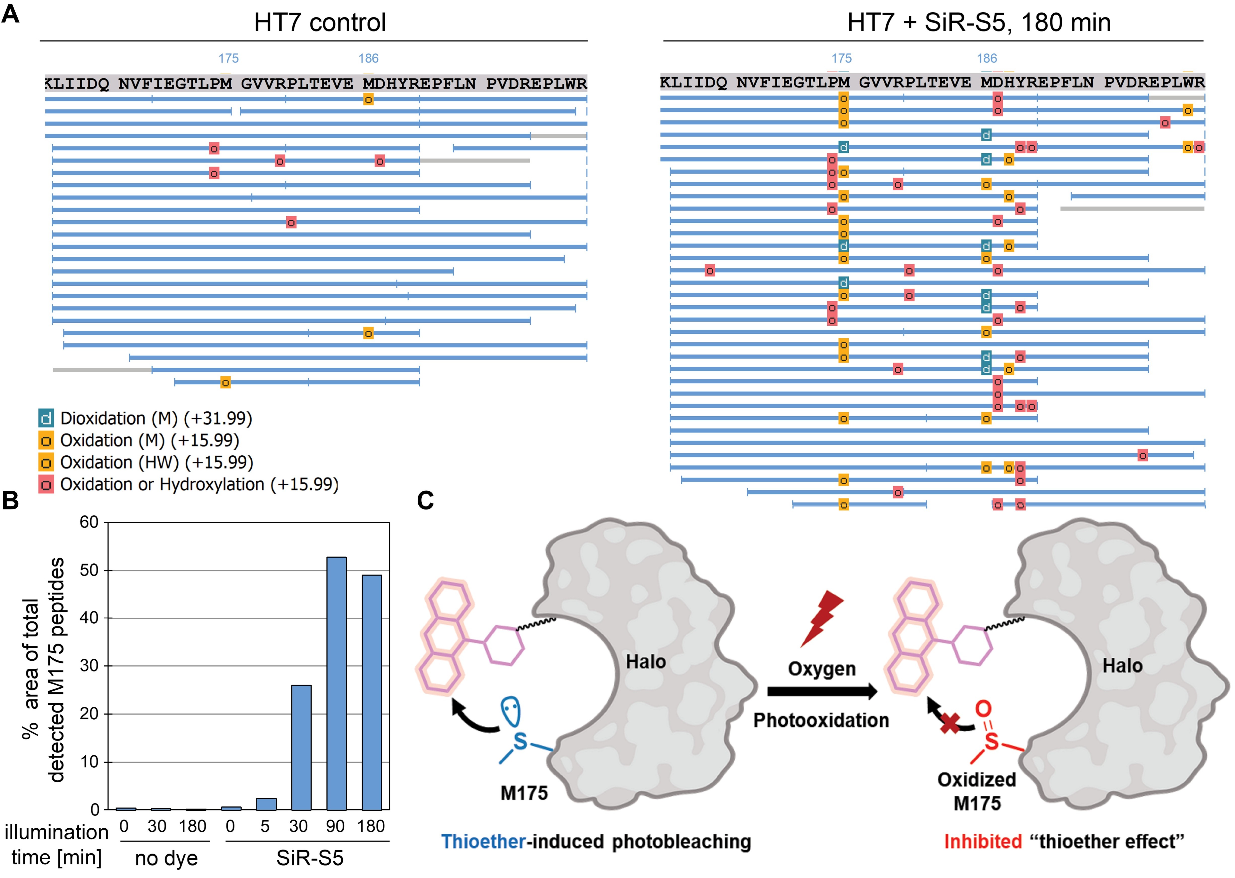 研究团队在多种细胞成像条件下观察到,M175与M175L之间的光漂白速率差异在初始阶段显著高于后续阶段,这可能源自不同阶段下不同的光化学机理。在前面的工具开发中,M175已经被证明为是HaloTag中可以提升光稳定性的关键位点。为进一步其背后的化学机制,研究团队与Kai Johnsson课题组的Julian Kompa展开合作,利用可交换HaloTag工具,对染料-蛋白复合体的光照过程进行蛋白质质谱监测。发展在染料被激发的条件下,HaloTag中的Met175发生了特征性的氧化。据此,研究团队推测,对于广泛应用于活细胞成像的HaloTag,其M175的存在导致了成像前期光漂白的加速;而后期,由于M175中的硫醚基团被氧化为亚砜或砜,使得硫醚效应不复存在,从而使得光漂白的后期不受到硫醚效应的干扰,进而减缓了光漂白速率(图3)。