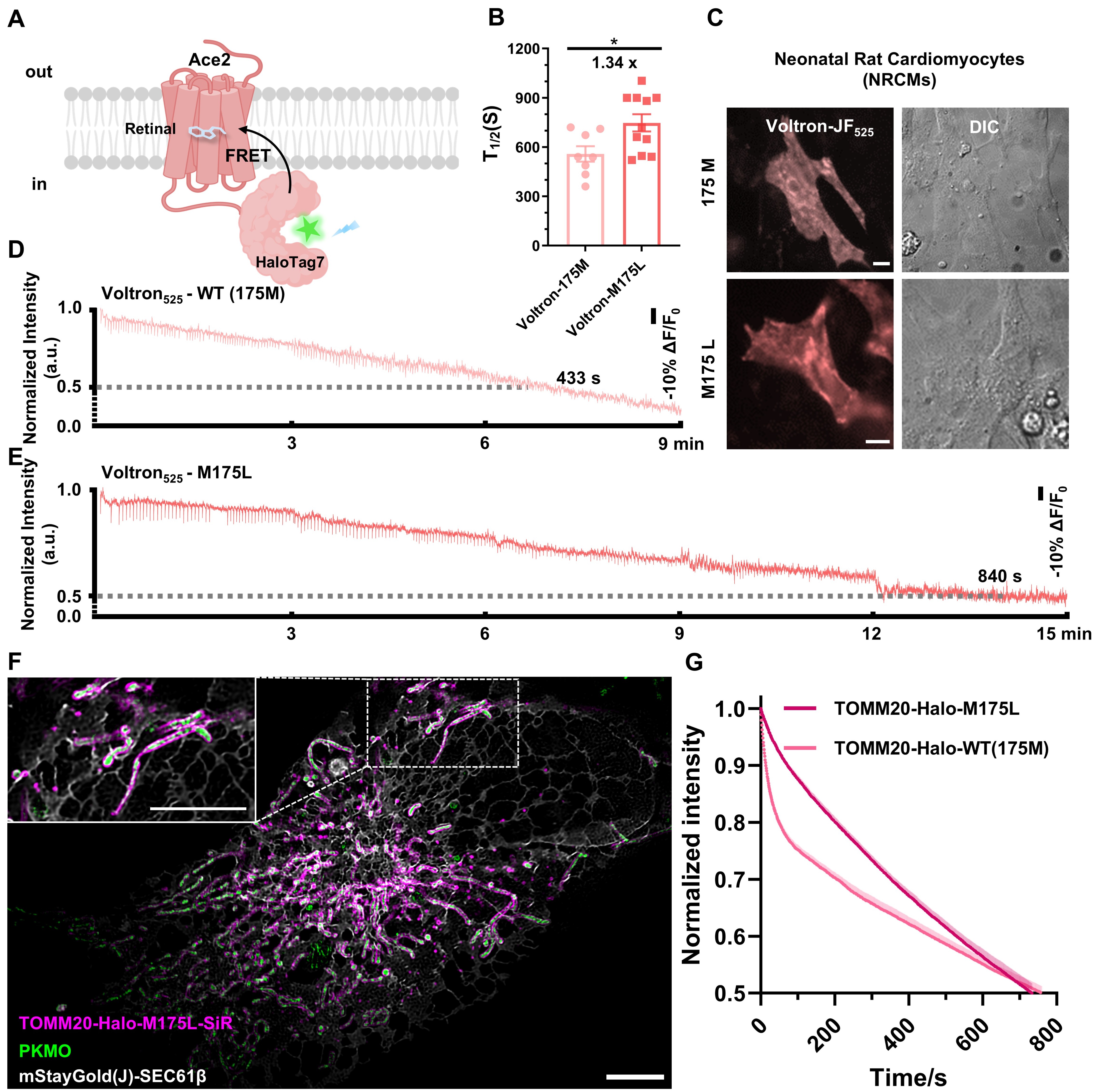 基于这一发现,研究团队进一步提出“硫醚编辑”策略——降低或消除荧光染料附近的“硫醚效应”可以显著提升染料的光稳定性。在验证了HaloTag系统中硫醚对于罗丹明类染料光稳定性的影响后,研究团队筛选出HaloTag: M175L突变体作为对于罗丹明类染料广泛适用的高光稳定性成像平台,并将其应用在了电压成像和结构光照明(SIM)超分辨成像中(图2),显著延长了高质量活细胞荧光成像时间。