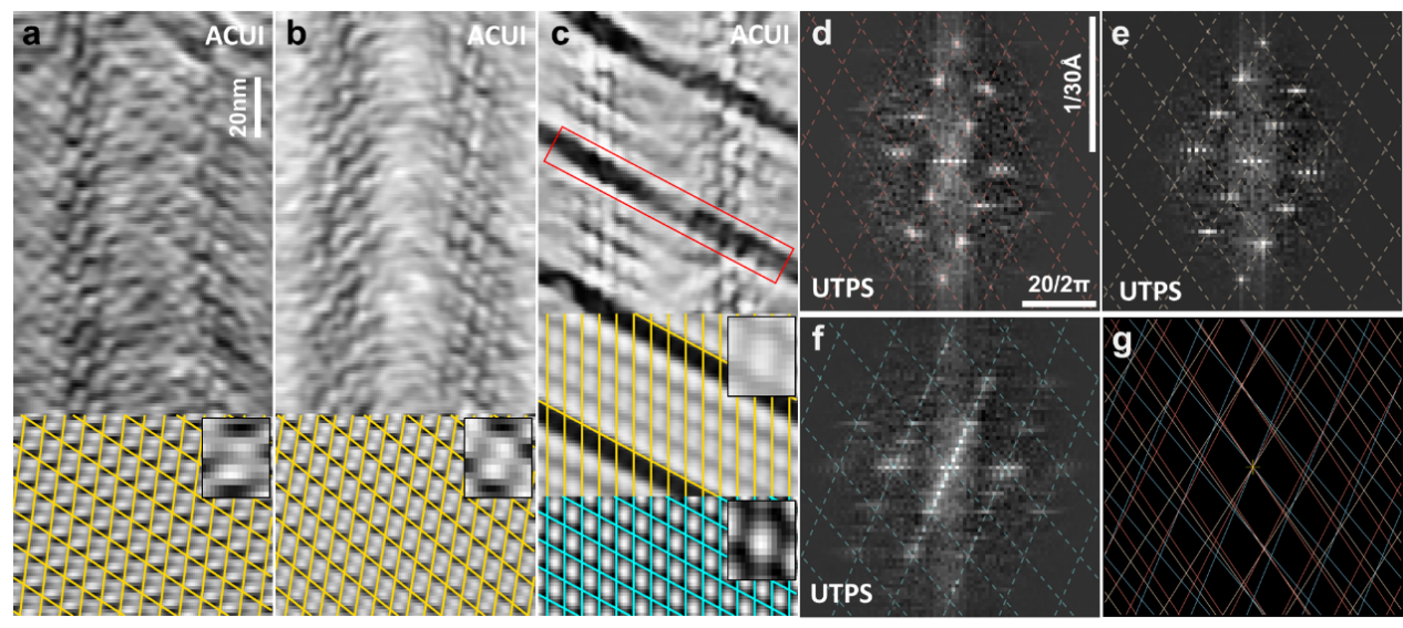 图3:MGF螺旋异质性分析。(a)-(c) MGF三种不同螺旋组装体的平均柱面展开图像,下方嵌入图为叠加晶格的对称平均图,右上角显示GMC氧化还原酶二聚体的放大图;(d)-(f) 与(a)-(c)对应的管状展开功率谱,虚线表示倒易晶格;(g) 倒易晶格差异比较。在同一图像中用相应颜色的直线网格展示了(d)-(f)中的倒易晶格。