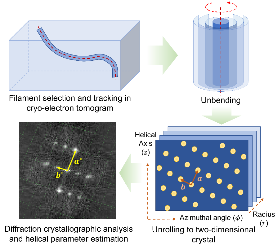 螺旋组装体(helical structure)广泛存在于细胞环境中,在细胞形态维持、物质运输、信息传递等的多种生物过程中扮演着重要角色,其三维结构的解析对于揭示相关的生物过程机制有重要的意义。螺旋参数的测定是实现螺旋结构三维结构解析的关键基础。目前常用的测定方法是层线法,通过对螺旋组装体电镜图像的功率谱中的线段状衍射图样进行测量与标定,以实现螺旋参数的解算。在实际应用中,冷冻电镜(cryo-electron microscopy,Cryo-EM)图像的极低信噪比(signal-to-noise rate, SNR)、螺旋组装体的柔性形变以及功率谱中的贝塞尔重叠(Bessel overlap)现象等问题,容易导致层线的模糊与偏移,使得该类方法的应用具有极大挑战性。此外,传统的层线法主要针对单颗粒图像设计,不适用于冷冻电子断层图像,制约了在原位结构解析中的应用。
