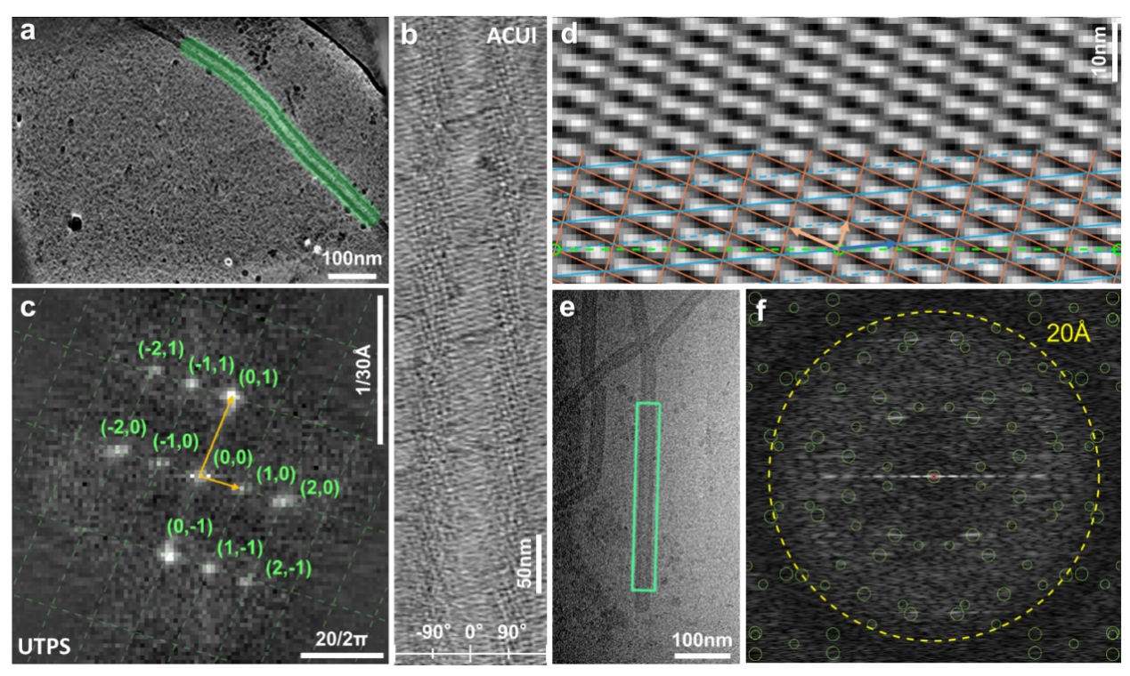 图2:LPOR膜管的实验结果。(a) 某根LPOR膜管的断层图像截面;(b) LPOR膜管的平均柱面展开图像;(c) LPOR膜管的管状展开功率谱。橙色箭头指示选定的一对倒易基向量,绿色数字表示衍射点的指标;(d) (b)的对称平均图像;(e) LPOR膜管的单颗粒图像;(f) LPOR膜管一段区域((e)中绿色框)的功率谱;在(b)和(c)中,水平方向和垂直方向的长度单位不同,两个方向分别提供比例尺。