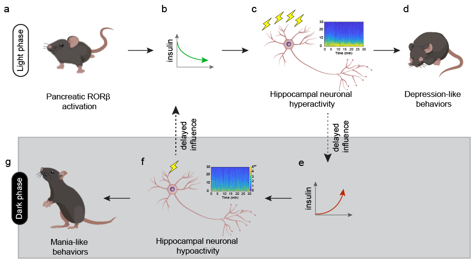 由于RORβ过表达会抑制胰岛素分泌,因此推测在光相的胰岛素分泌不足和抑郁样行为是RORβ过表达的直接后果,暗相的胰岛素分泌过度和躁狂样行为是代偿作用产生。为了理解这个过程的发生,课题组结合化学遗传学和在体电生理技术,阐明了大脑海马脑区和胰腺之间胰-脑轴的工作原理,以及RORβ在光相通过扰动胰-脑轴使得小鼠在暗相出现躁狂样行为的机理。具体发生过程如下:i) RORβ在胰岛表达上调在光相阶段抑制胰岛素分泌;ii) 胰岛素缺乏导致海马神经元活动上调;iii) 光相中海马区过度活跃不仅引发了抑郁样行为,还产生了延迟且持久的反馈效应,促进了暗相胰岛素的释放;iv) 暗相胰岛素分泌上调对海马神经元活动产生抑制,从而产生了次级的躁狂症状;v) 小鼠在暗相的海马区低活性减弱了光相胰岛素分泌的驱动力,因此暗相胰岛素分泌的高水平无法在光相维持,胰岛素水平开始回落;vi) 当胰岛素分泌返回初始点后,胰岛RORβ过表达启动下一个循环,从而形成一个昼夜闭环。