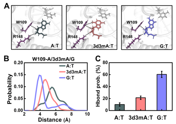 更深入的作用分析结果表明,W109与3d3mA之间更强的相互作用主要源于3d3mA碱基上的甲基取代基。这种取代基不仅使3d3mA与W109之间的距离更近,还增强了W109与3d3mA核糖部分之间的CH−π相互作用(图3)。而W109与错配G之间的强相互作用,则主要源自G的旋转构型。这种旋转构型也使得R148与G之间形成的氢键数量比与A之间的多出∼6倍。此外,R148与3d3mA形成的氢键作用强度也显著高于与A的氢键作用强度。