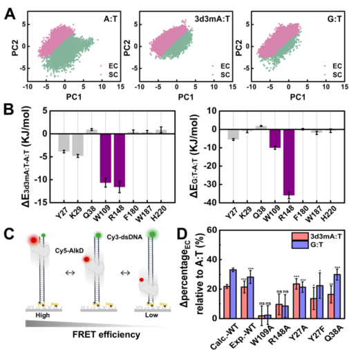 研究团队进一步探索了在DNA损伤(3d3mA:T)和错配(G:T)存在时AlkD两种构象状态的响应机制。分子动力学模拟以及FRET-FCS实验均显示,DNA中引入了损伤和错配之后,慢速模式对应的切割构象EC态比例出现了显著的提高(图2A和2D),表明AlkD−dsDNA复合物的构象分布对损伤和错配的存在十分敏感。为了阐明AlkD如何识别损伤和错配,研究团队选取了能够区分EC态与SC态的残基作为潜在分子探针,并评估了它们在3d3mA:T和G:T体系中相对于A:T体系与核苷酸的相互作用能(图2B),发现只有W109和R148能同时响应3d3mA和G:T。通过扫描FRET-FCS实验,进一步验证了W109和R148在定位损伤和错配中的关键作用(图2C和2D)。