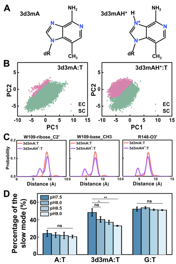 研究团队在实验中还发现,当3d3mA被质子化时,AlkD的EC态占据比例会提高(图5B)。并且,W109和R148能够有效区分3d3mA的质子化与中性状态,从而解释了AlkD选择性切除带正电荷损伤的分子机制。