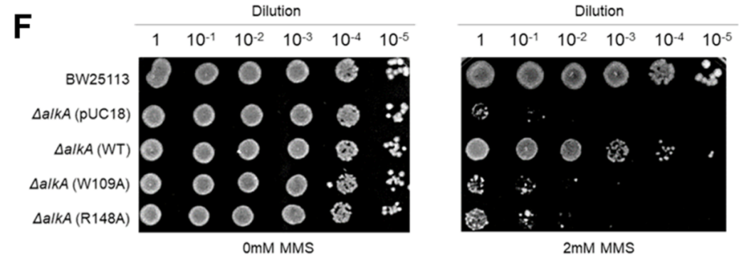 为进一步验证野生型AlkD与W109A、R148A突变体清除烷基化碱基的能力,研究团队进行了细胞实验。实验采用大肠杆菌alkA基因敲除菌株,该菌株在接触烷基化试剂甲基磺酸甲酯(MMS)时会表现出烷基化敏感表型。结果显示,携带野生型AlkD质粒的敲除菌株对MMS的耐受性显著提升,而携带W109A和R148A突变质粒的菌株,其对MMS的敏感性与空载pUC18载体转化株基本相当(图4),在细胞水平上证明了W109和R148对烷基化损伤修复的重要作用。