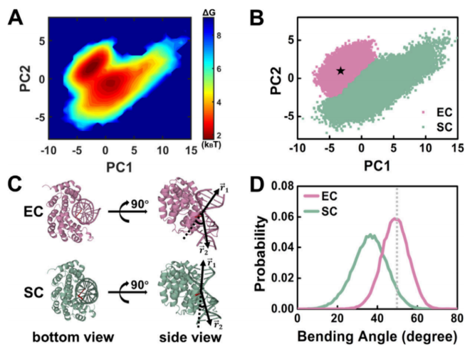 分子动力学模拟显示,AlkD结合未损伤DNA时存在两种不同构象(图1):切割构象(EC)下DNA弯折更大、与蛋白相互作用更紧密;搜索构象(SC)则更松散、利于在DNA上快速滑动。这与团队在前期工作中利用扫描 FRET-FCS 观察到的“慢/快”扩散模式相对应(https://doi.org/10.1073/pnas.2002971117)。