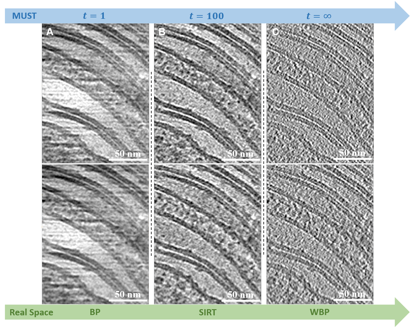 冷冻电子断层成像(cryo-electron tomography, cryoET)技术可以观察细胞中生物大分子的原位结构,近年来受到了广泛关注。在cryoET的数据处理流程中,高质量的三维断层重建(tomogram reconstruction)对于展现样品整体形貌以及后续的子断层平均(subtomogram averaging)十分重要。虽然许多图像处理步骤都是在傅里叶空间(Fourier space)中进行的,但是由于断层重构的密度图(tomogram)尺寸非常大,实现基于傅里叶空间的重建依然存在挑战。因此,目前三维断层成像三维重建的常用方法仍为实空间(real space)方法,如加权背投影(weighted back-projection,WBP)、同步迭代重建技术(simultaneous iterative reconstruction technique,SIRT)等。