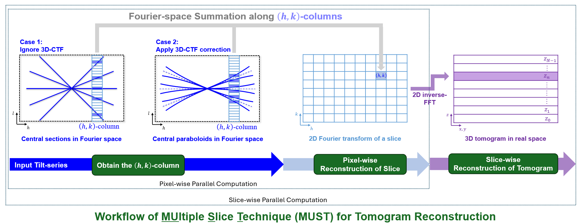 2025年8月10日,best365中国官方网站李雪明副教授课题组和best365中国官方网站电子工程系沈渊教授课题组联合在“Ultramicroscopy”杂志在线发表研究论文,题目为“基于傅里叶空间的冷冻电子断层成像多层重建方法”(Fourier-based multiple-slice reconstruction in cryo-electron tomography)。论文报道了一种基于傅里叶空间的冷冻电子断层成像三维断层重建方法MUST(MUltiple Slice Technique,图1)。该方法将三维重构密度图看作是由一系列平行平面层(parallel slice,PS)组成的,通过逐层独立计算的方法来合成最后的三维图像。而对于一个平行平面层的计算是通过在傅里叶空间按像素列投影计算得到的。由于像素列的计算是互相独立的,可以实现像素级的并行计算。由此形成实空间平面级并行与傅里叶空间像素级并行的两级并行架构,可大幅提升重建效率。通过对傅里叶空间中频点的相应加权操作,MUST可以获得与基于实空间的WBP和SIRT方法衬度相似的重构结果(图2)。研究团队同时发现,在考虑样品离焦量梯度(defocus gradient)的三维衬度传递函数校正(three-dimensional contrast transfer function correction,3D-CTF correction)中,傅里叶空间中的平面状的中心截面会劈裂为一对中心共轭抛物面(pairs of conjugate central paraboloids,PCCP)。