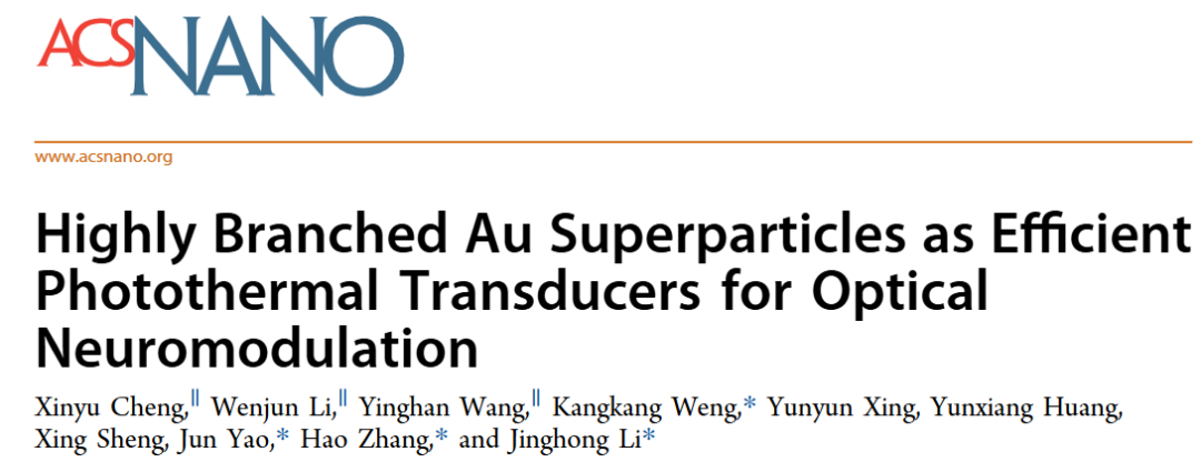 best365中国官方网站化学系李景虹、张昊、生命学院姚骏、化学系瓮康康共同通讯团队聚焦于通过结构设计提升光热转换材料性能,成功设计出一种新型高效光热转换材料——高度分支的Au超粒子(3D Au superparticles),并利用其实现精准的神经活动控制。相关研究成果以“高支化金超粒子作为光学神经调节的高效光热传感器”(Highly Branched Au Superparticles as Efficient Photothermal Transducers for Optical Neuromodulation)为题在线发表于ACS Nano期刊。