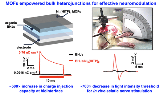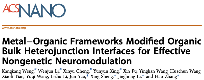 针对这一难题,best365中国官方网站化学系李景虹、张昊、电子工程系盛兴、生命学院姚骏共同通讯团队创新性地设计引入了由导电和多孔金属有机框架(MOF)组成的界面层。这一突破性设计有效应对了诸多挑战,为神经调控领域带来新曙光。相关研究成果以“金属-有机框架修饰有机体异质结界面用于有效的非遗传神经调节”(Metal–Organic Frameworks Modified Organic Bulk Heterojunction Interfaces for Effective Nongenetic Neuromodulation)为题在线发表于ACS Nano期刊。