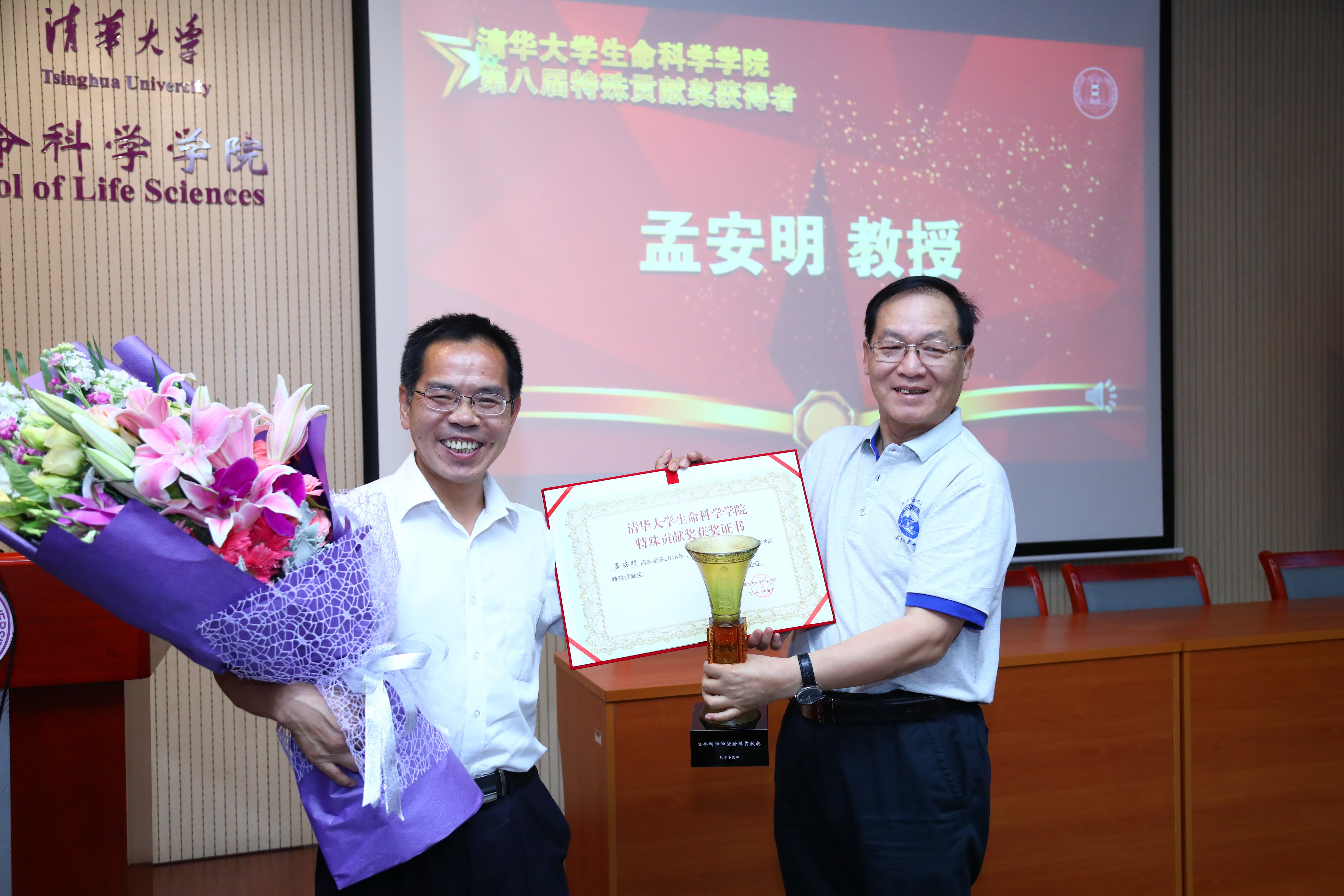 2018年5月31日,生命学院举行2018年度“特殊贡献奖” 颁奖仪式,获奖者为孟安明院士。副院长戚益军主持会议,党委书记陈应华为孟安明院士颁奖。会议在生命科学馆143会议室举行,生命学院全体教职工出席。