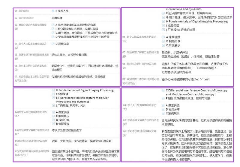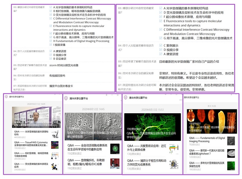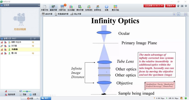 会上8位授课嘉宾分别就显微成像研究与技术领域为学员进行授课,从显微镜的成像光路、各类显微镜成像原理、分辨率的数学推导到显微镜的最新应用、超高分辨的发展方向、大组织快速光片技术和数据处理技术等,使学员们经历了一次系统的显微成像之旅。同时,为了弥补疫情期间无法实地安排学员上机的不足,best365中国官方网站生物医学测试中心和西湖大学生物医学实验技术中心特别录制了光学成像仪器拆装机视频和电子化操作教程,具有多年从事显微成像技术的资深专业人员为学员们打开了一种新的学习体验,深受大家的好评。每天会议结束后,主办方将问答列表整理成文字形式,及时反馈,解决了线上无法面对面交流的不足,得到学员的一致认可。