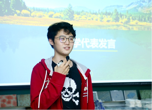 接着,学生代表钟砺涵发言。他回顾了课题小组异地合作的经历,并分享了从文献调研、提出假设、设计实验、分析数据到形成结论这一科学研究全过程的体验和感受,以及团队协作带来的收获。