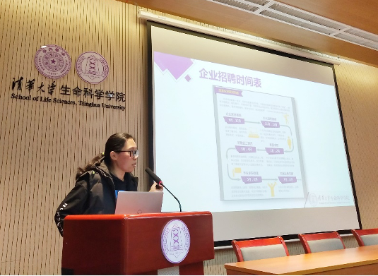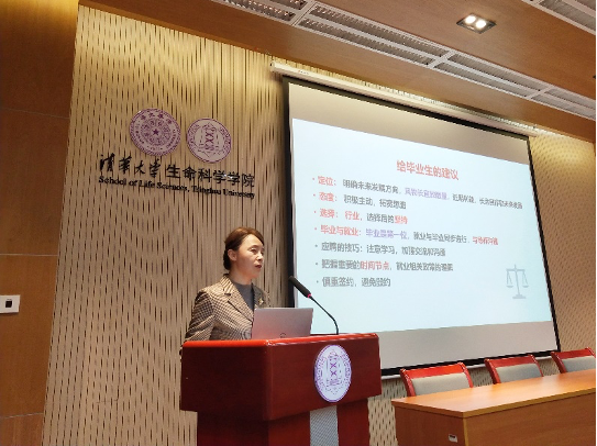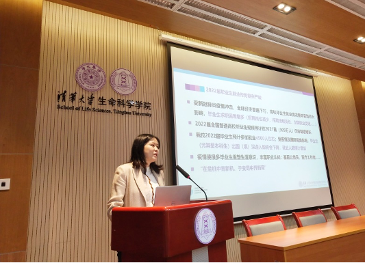 董园介绍了近年来学院毕业生就业的行业、单位性质和地域选择等相关情况。目前,生命学院博士毕业的就业单位主要集中在高等院校、科研单位、生物医药相关企业。近60%的博士毕业生直接就业,40%以上的博士毕业生选择做博士后,继续从事学术研究工作。此外,她还重点介绍了毕业、就业手续办理流程以及获取就业信息的渠道,希望同学们能主动关注就业信息,积极参加学校学院组织的招聘活动。